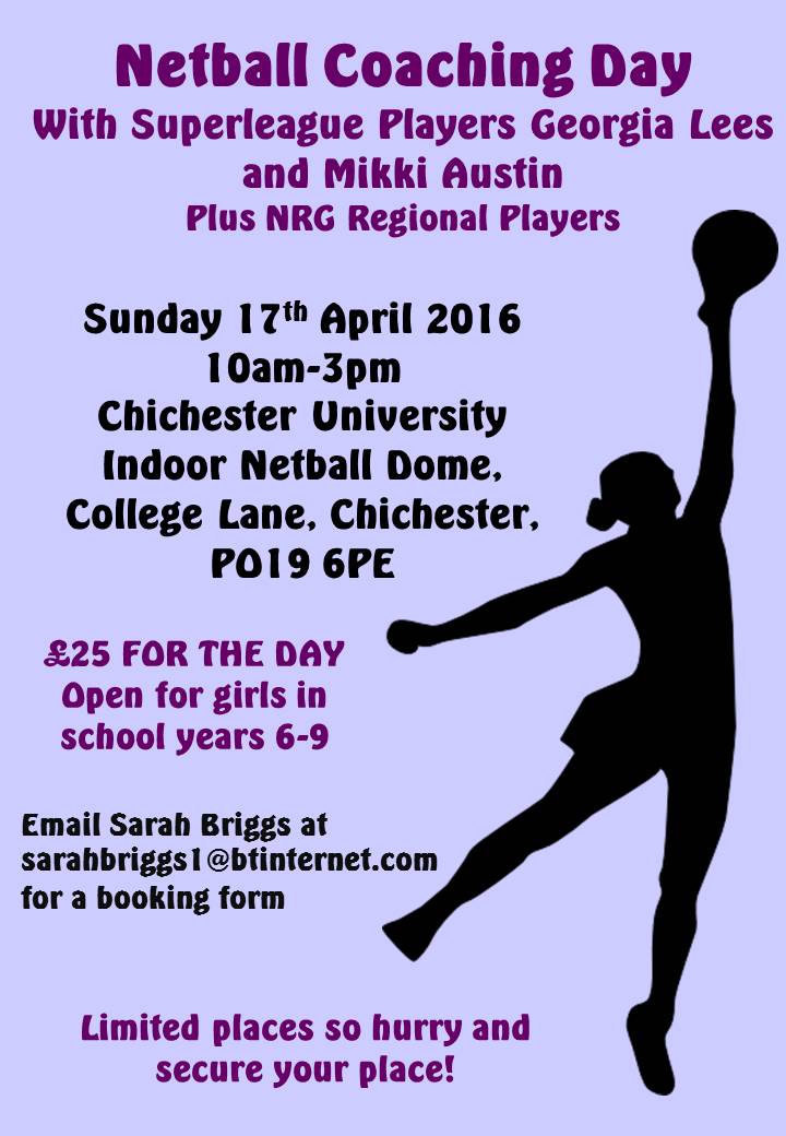 9.30-3pm - years 9 and 10 Performance Camp. Open to girls who are at Regional or County League level. Cost is £25, at Worthing College.